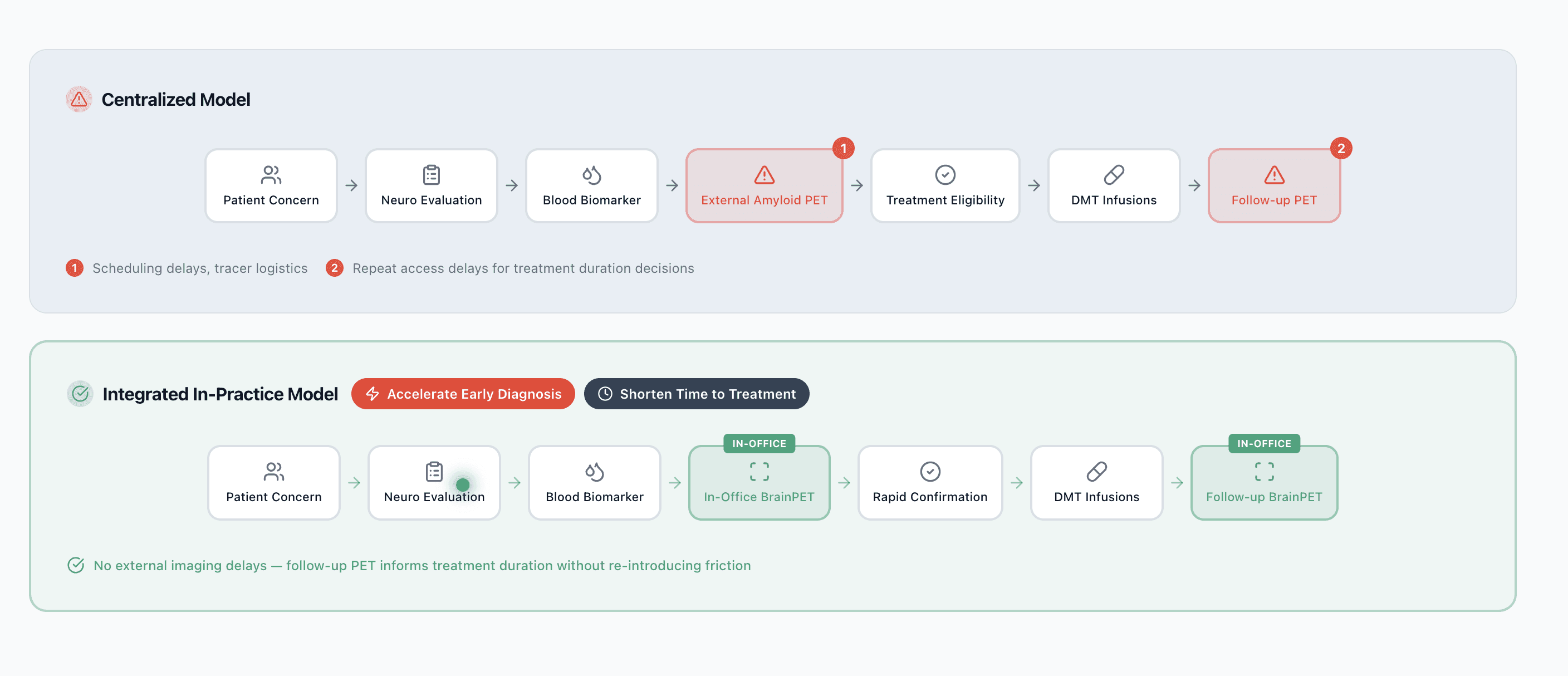 With in-office brain PET, the entire Alzheimer's care pathway stays within your practice. One practice, one team, unified care from first suspicion to long-term monitoring.